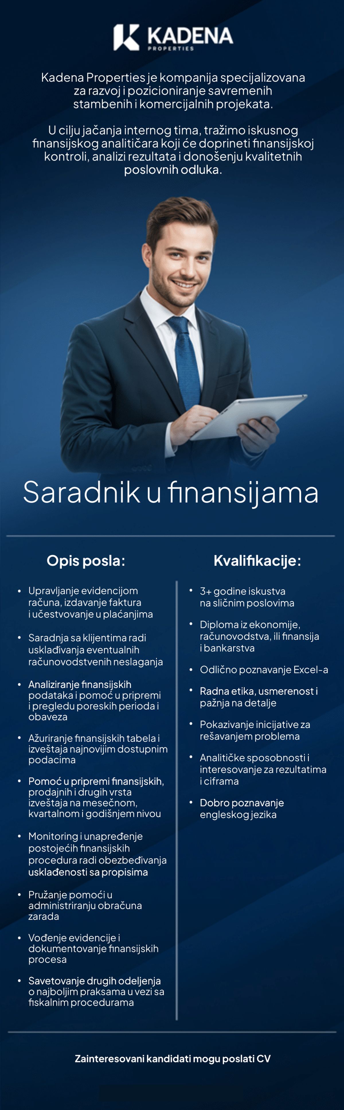 Napomena: Poslovi.infostud.com ne vrši posredovanje u zapošljavanju u Srbiji, niti u inostranstvu. Postupak selekcije i odabira kandidata je u nadležnosti poslodavca, a odredbe ugovora o radu predstavljaju direktan dogovor između poslodavca i zaposlenog. Svi pojmovi u oglasima, koji su upotrebljeni u muškom rodu, odnose se bez diskriminacije i na osobe ženskog pola i obrnuto, osim ukoliko specifičnim zahtevima posla nije drugačije propisano.