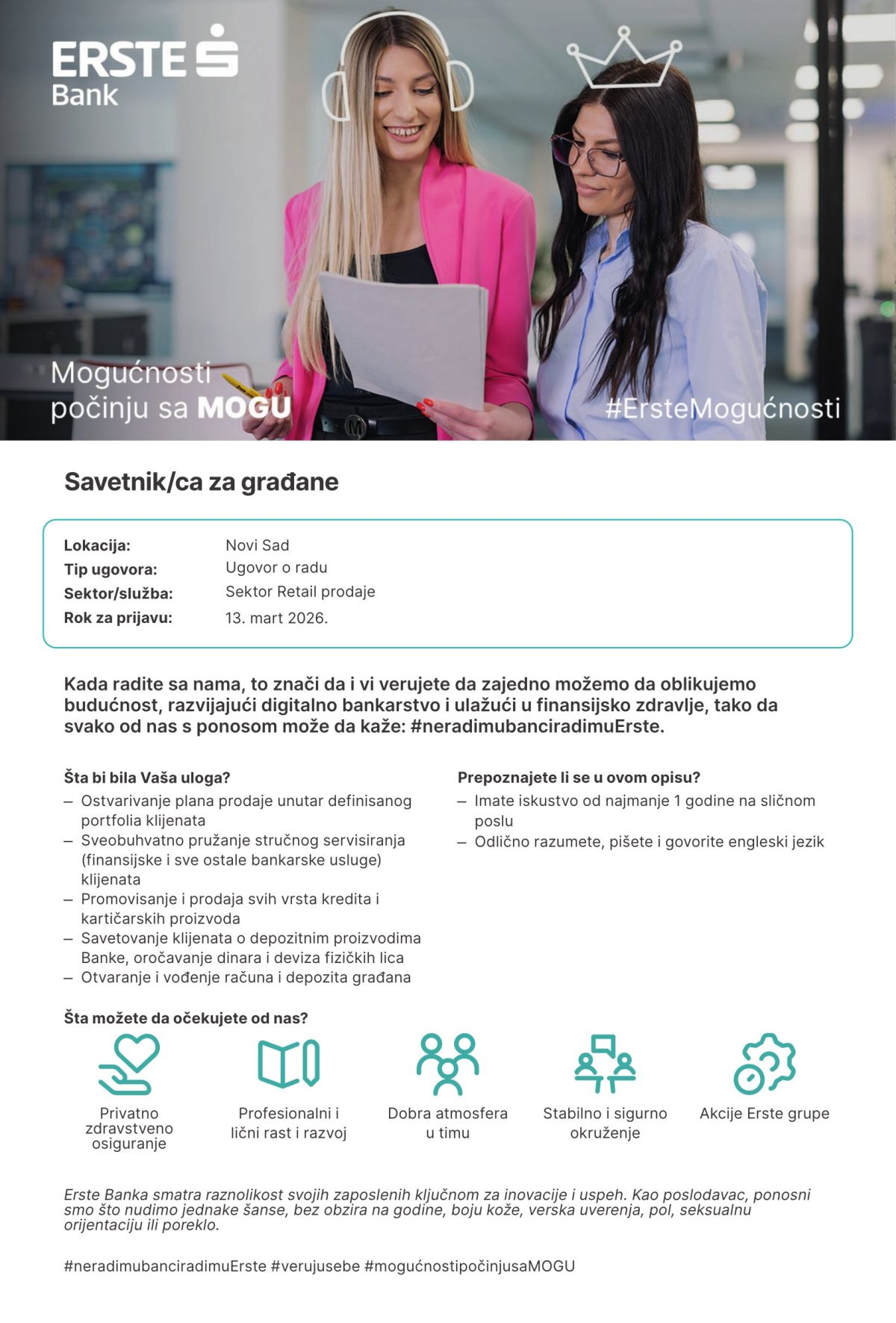 Mi smo ERSTE, gde Mogućnosti počinju sa MOGU Zamisli sebe u svetu mogućnosti uz ljude koji te podržavaju, inspirišu i gde možeš da da iskažeš svoju jedinstvenost kreirajući posebnu vrednost za sve naše klijente. To je ERSTE. Mi verujemo u radno okruženje u kojem se neguje zajedništvo, sloboda da stvaramo i gde se slave uspesi. Otvoreni smo prema novim idejama, jer izazove vidimo kao priliku za učenje i razvoj. Kada si deo našeg tima onda uvek imaš nekoga koga možeš da pitaš kako i zašto.…