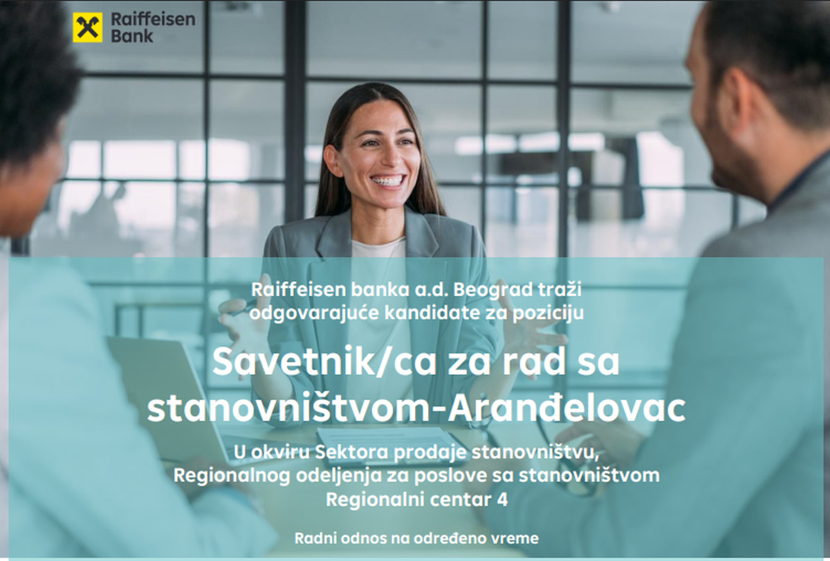 Raiffeisen banka jedna je od vodećih banaka po kvalitetu i brzini usluge koju pruža svojim klijentima širom Srbije. U cilju kreiranja superiornog korisničkog iskustva, među prvima smo započeli digitalnu transformaciju poslovanja, po čemu smo prepoznati kao lider na bankarskom tržištu Srbije. U našim filijalama dočekaće te način razmišljanja koji podstiče fleksibilnost, brzo učenje, timski rad i kontinuirano poboljšanje, kao i kultura međusobnog razumevanja, poštovanja i poverenja. Ukoliko deliš naše vrednosti i ako želiš da stekneš nova znanja i iskustva u oblasti modernog bankarstva, prijavi se!