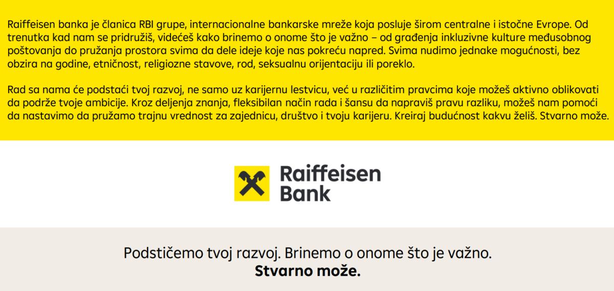 Izgradi karijeru na mestu gde se tvoj rad ceni i može da napravi razliku. U Raiffeisen banci, imaćeš priliku da rano preuzmeš odgovornost i iskusiš razvoj koji prevazilazi uspon na karijernoj lestvici. Tvoja ekspertiza će nam pomoći da zadržimo fokus na onome što je najvažnije - nastavku građenja odnosa poverenja sa našim zadovoljnim klijentima. Verujemo da je personalizovan pristup ono što otvara nove mogućnosti, a on počinje doprinosom talentovanih ljudi poput tebe.