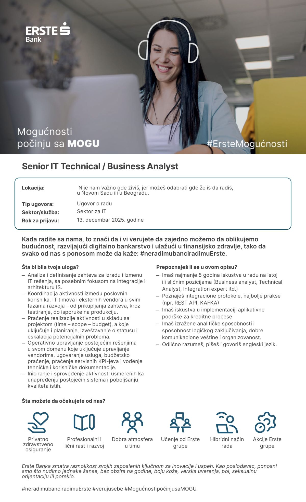 Mi smo ERSTE, gde Mogućnosti počinju sa MOGU Zamisli sebe u svetu mogućnosti uz ljude koji te podržavaju, inspirišu i gde možeš da da iskažeš svoju jedinstvenost kreirajući posebnu vrednost za sve naše klijente. To je ERSTE. Mi verujemo u radno okruženje u kojem se neguje zajedništvo, sloboda da stvaramo i gde se slave uspesi. Otvoreni smo prema novim idejama, jer izazove vidimo kao priliku za učenje i razvoj. Kada si deo našeg tima onda uvek imaš nekoga koga možeš da pitaš kako i zašto.…
