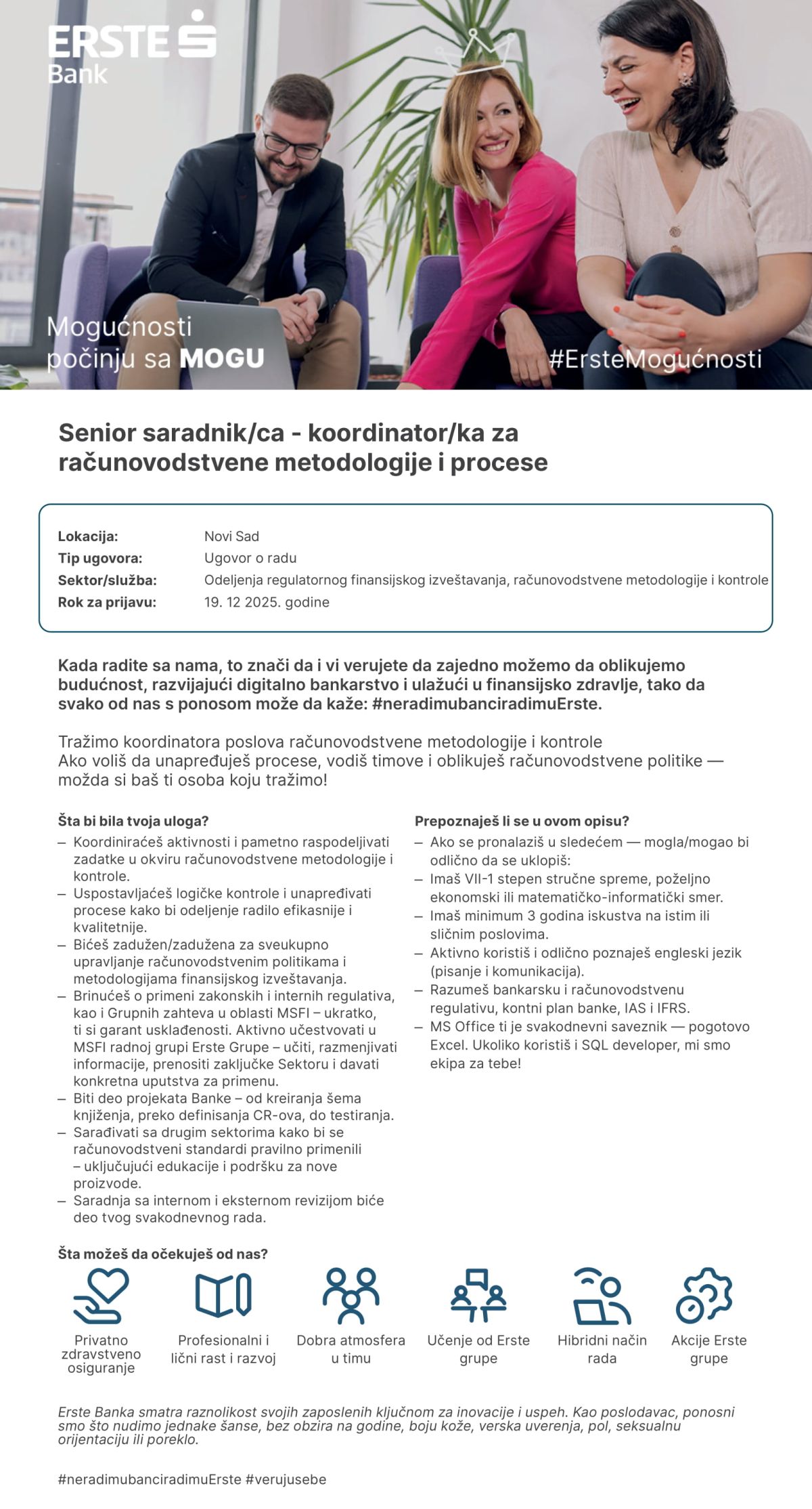 Mi smo ERSTE, gde Mogućnosti počinju sa MOGU Zamisli sebe u svetu mogućnosti uz ljude koji te podržavaju, inspirišu i gde možeš da da iskažeš svoju jedinstvenost kreirajući posebnu vrednost za sve naše klijente.  To je ERSTE. Mi verujemo u radno okruženje u kojem se neguje zajedništvo, sloboda da stvaramo i gde se slave uspesi. Otvoreni smo prema novim idejama, jer izazove vidimo kao priliku za učenje i razvoj. Kada si deo našeg tima onda uvek imaš nekoga koga možeš da pitaš kako i zašto.…