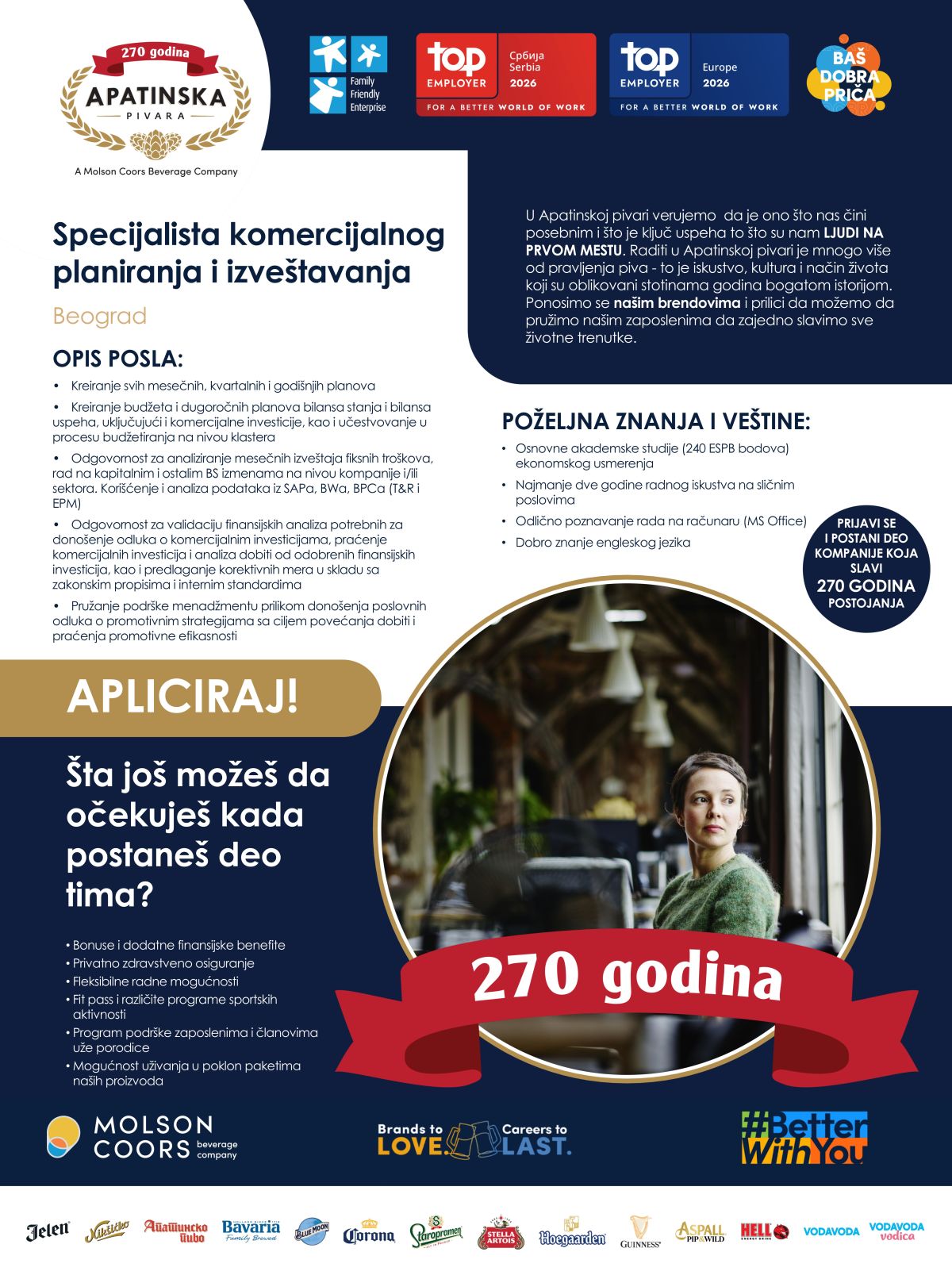 Apatinska pivara, Molson Coors Beverage Company Apatinska pivara, deo jedne od najvećih globalnih pivarskih kompanija, Molson Coors Beverage Company, jedan je od lidera u proizvodnji piva na domaćem tržištu. Nastala davne 1756. godine, Apatinska pivara je ujedno i najstarija pivara koja posluje u okviru ove grupacije. Danas Molson Coors Beverage Company u svetu broji oko 17.600 zaposlenih, dok nas je u Srbji oko 700. Pored tržišta Kanade, Sjedinjenih Američkih Država, Ujedinjenog Kraljevstva i…