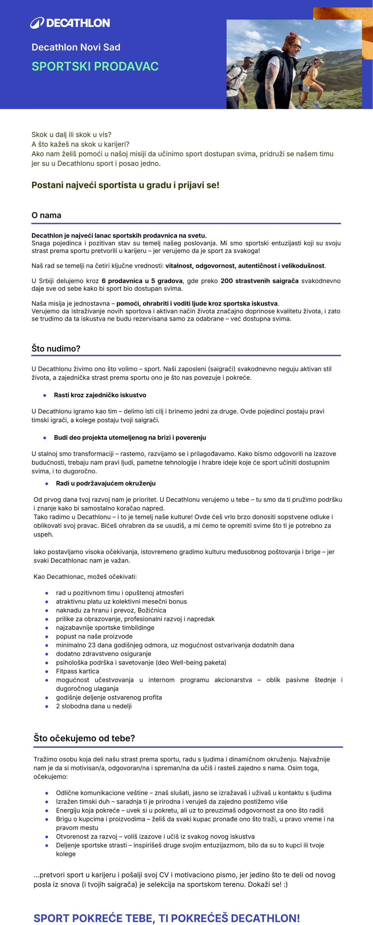 Decathlon d.o.o. je najveći svetski maloprodajni lanac sportske opreme, osnovan je 1976.godine u Lilu, u Francuskoj. Misija kompanije je sport dostupan svima, a naša svrha je biti koristan za ljude i planetu. U ponudi imamo širok izbor proizvoda visokog kvaliteta za različite nivoe bavljenja…