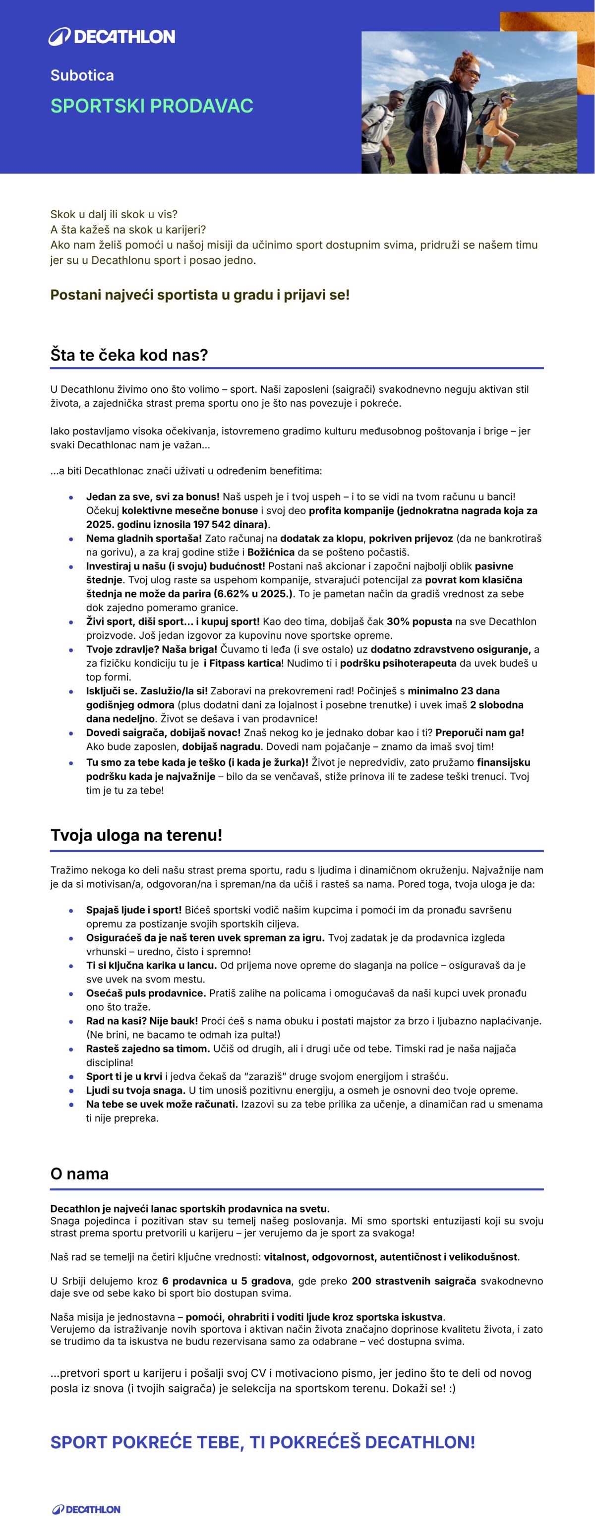 Decathlon d.o.o. je najveći svetski maloprodajni lanac sportske opreme, osnovan je 1976.godine u Lilu, u Francuskoj. Misija kompanije je sport dostupan svima, a naša svrha je biti koristan za ljude i planetu. U ponudi imamo širok izbor proizvoda visokog kvaliteta za različite nivoe bavljenja…