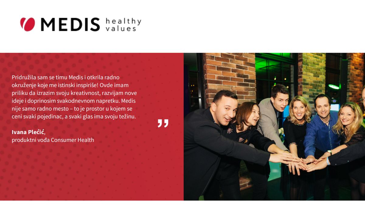 Medis Pharma, u sastavu međunarodne kompanije Medis, je preduzeće sa dugogodišnjim iskustvom u medicinskom marketingu i partner je vodećih multinacionalnih proizvođača lekova i medicinske opreme. Sa više od 400 zaposlenih visoko osposobljeni stručnjaka u devetnaest država srednje Evrope i Balkana Medis ostvaruje odlične rezultate. Stručni saradnik za bolnički sektor | ![]() |