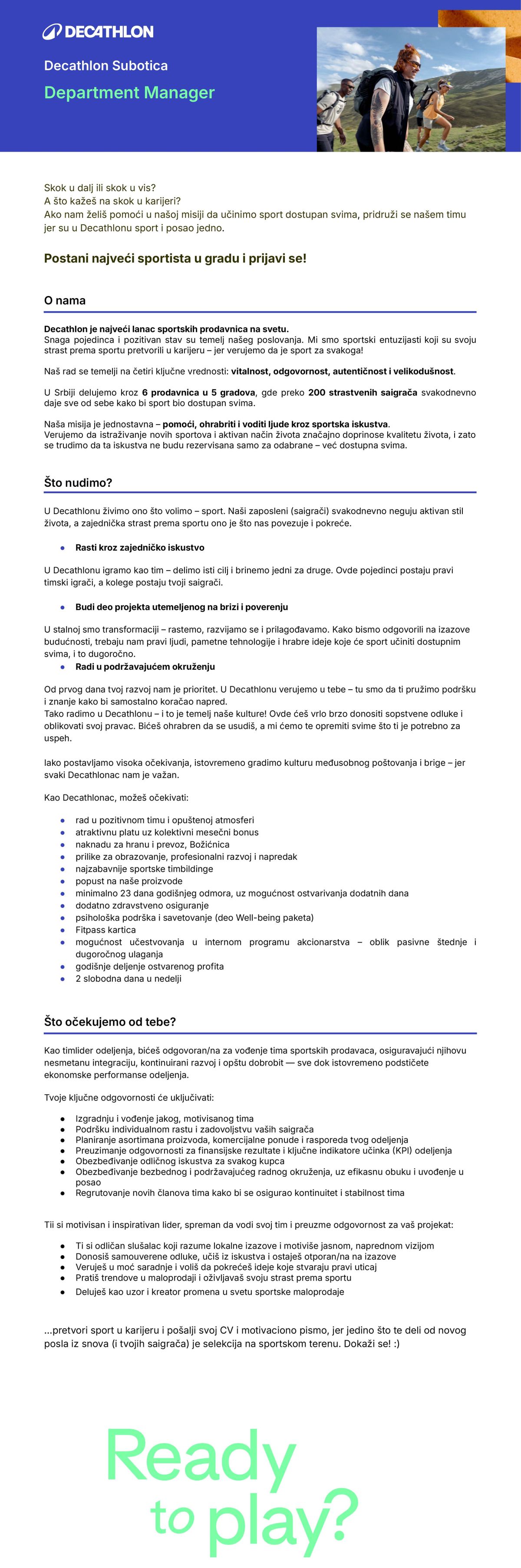 Decathlon d.o.o. je najveći svetski maloprodajni lanac sportske opreme, osnovan je 1976.godine u Lilu, u Francuskoj. Misija kompanije je sport dostupan svima, a naša svrha je biti koristan za ljude i planetu. U ponudi imamo širok izbor proizvoda visokog kvaliteta za različite nivoe bavljenja…