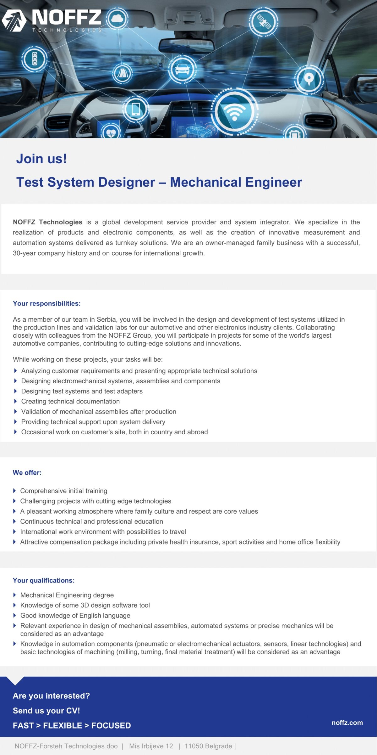 NOFFZ-Forsteh Technologies d.o.o. je lokalno predstavništvo kompanije NOFFZ Technologies GmbH, nastalo integracijom kompanije Forsteh d.o.o. u NOFFZ grupu. NOFFZ Technologies je porodična kompanija čija je osnovna ekspertiza dizajn, razvoj i proizvodnja test sistema, potpuno prilagođenih specifičnim potrebama korisnika. Osnovan 1989. godine NOFFZ Technologies je danas jedan od lidera među sistem integratorima najsavremenijih test rešenja u automobilskoj i telekomunikacionoj industriji. Sa preko…